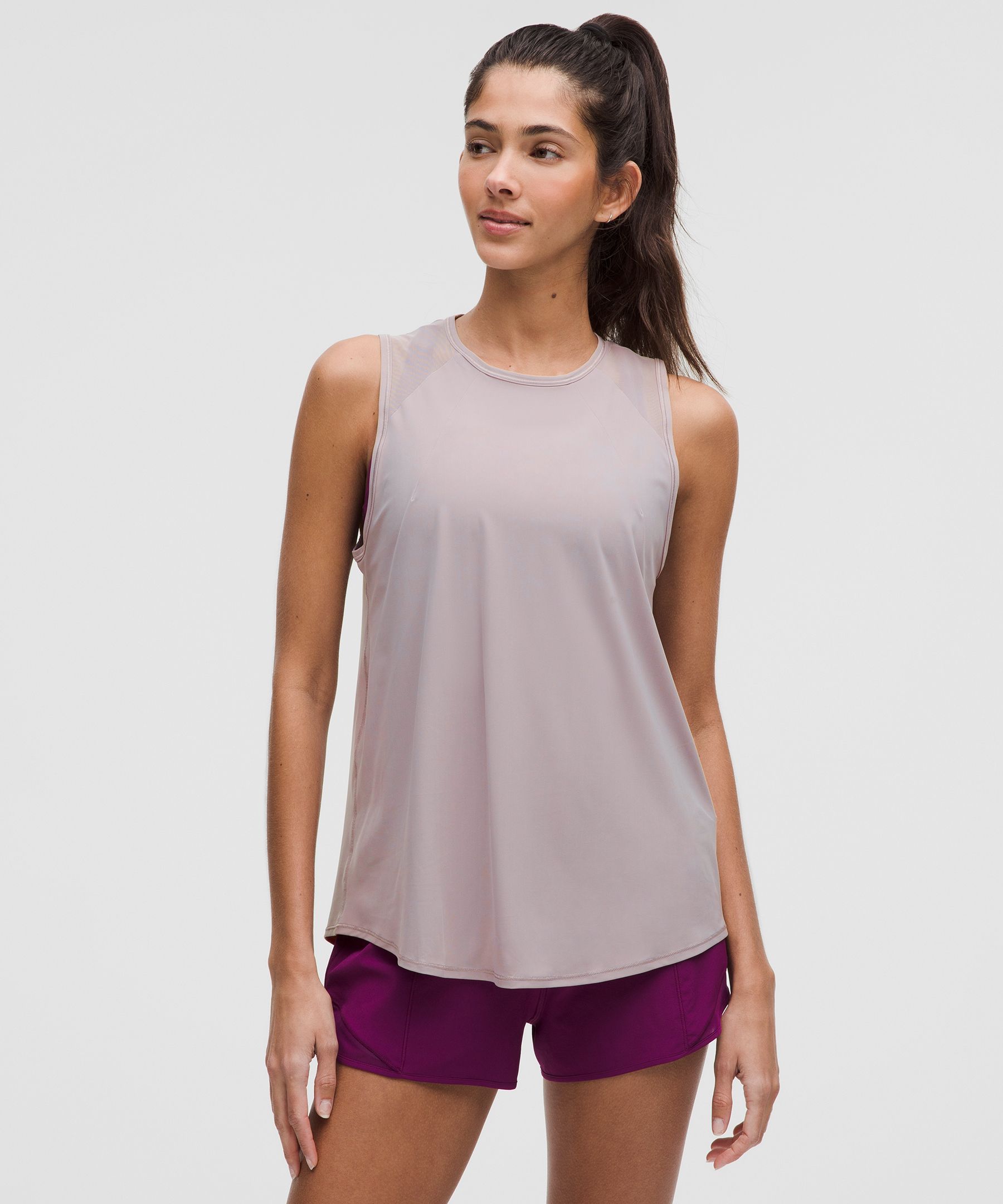 Lightweight, Reflective. Designed for Running. An easy fit that floats away from your body. Sits below the waistband for moderate, everyday coverage. Sprints anyone? This lightweight tank has mesh fabric panels for breathability in sweaty situations. | lululemon – Women’s Sculpt Tank Top – Color Grey/Pink – Size 18