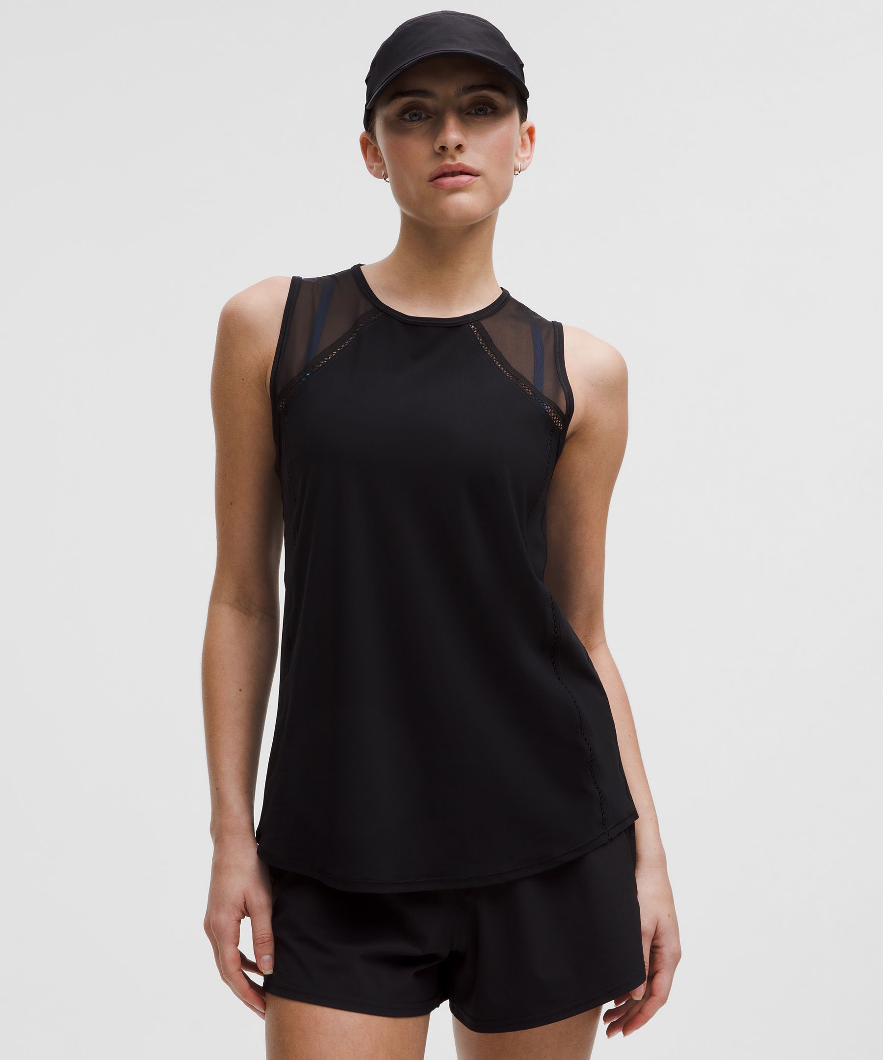 Lightweight. Designed for Running. An easy fit that floats away from your body. Sits below the waistband for moderate, everyday coverage. Sprints anyone? This version of our lightweight tank has lace details and more mesh for enhanced airflow and a delicate touch. | lululemon – Women’s Sculpt Tank Top Lace Trim – Color Black – Size 18