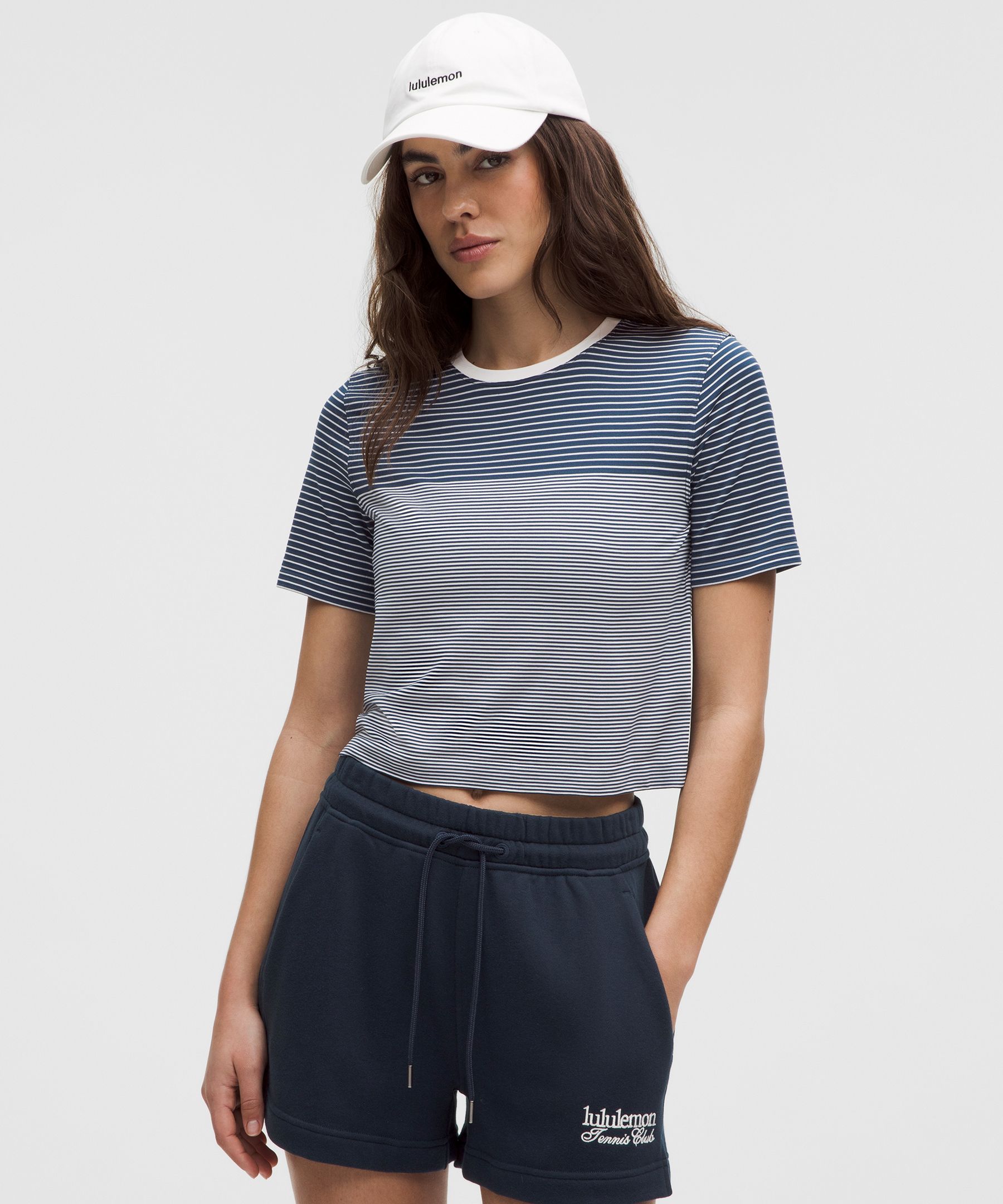 Anti Stink, Seamless. Designed for Running and Training. An easy fit that floats away from your body. Cut above the waist-perfect with high-rise pants. Je suis sporty. This top combines classic French-inspired stripes with our seamless technology for a look that transitions from workout to hangout. | lululemon – Women’s Seamless Classic-Fit Mariner Stripe Cropped T-Shirt – Color Blue/White – Size Large