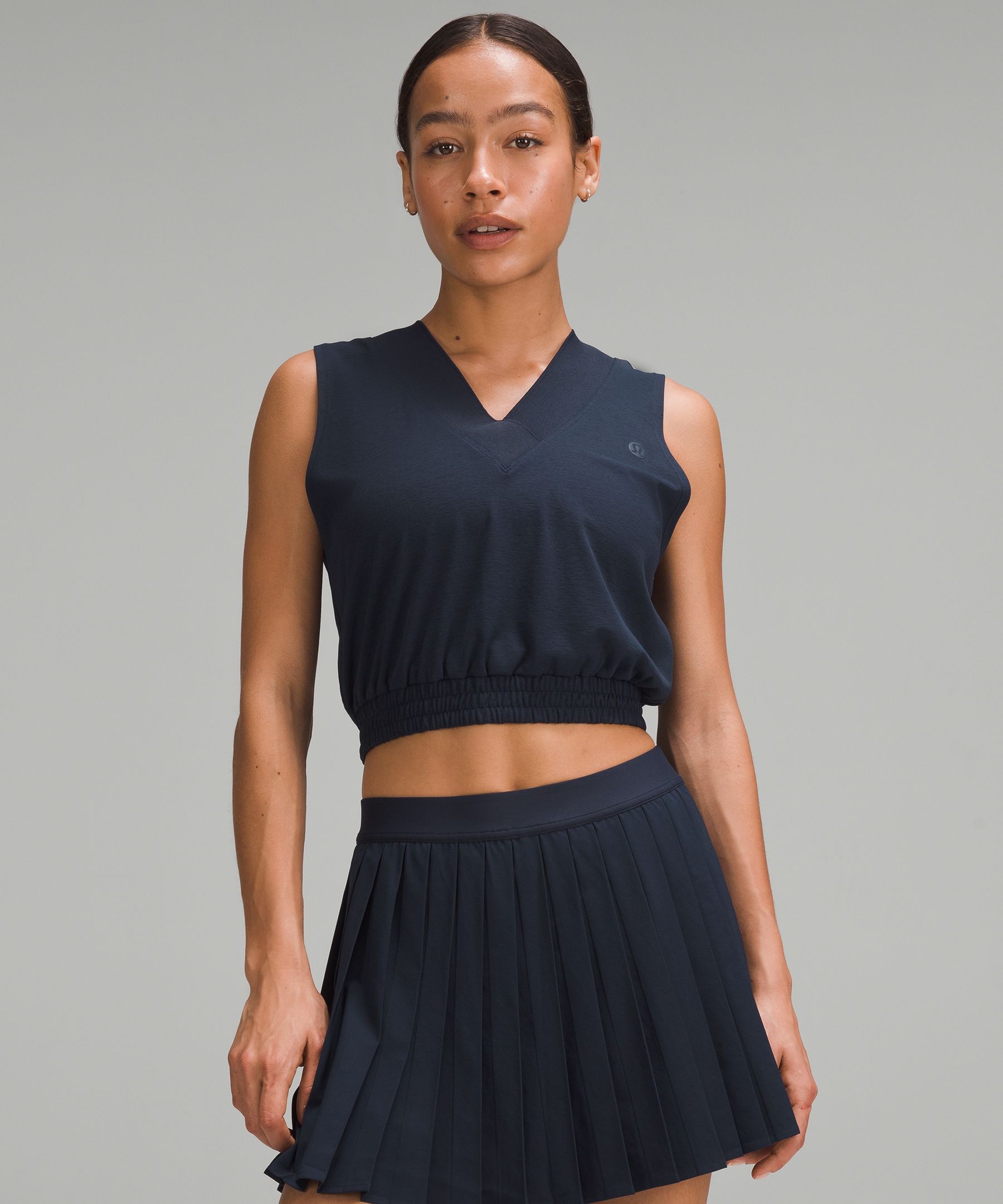 Designed for Tennis. An easy fit that floats away from your body. Cut above the waist-perfect with high-rise pants. Feel like a champ while perfecting your swing. This softly textured tennis tank wicks sweat and dries quickly so you can practice without distractions. | lululemon – Women’s Sleeveless Cropped Tennis Tank Top – Color Blue – Size 6