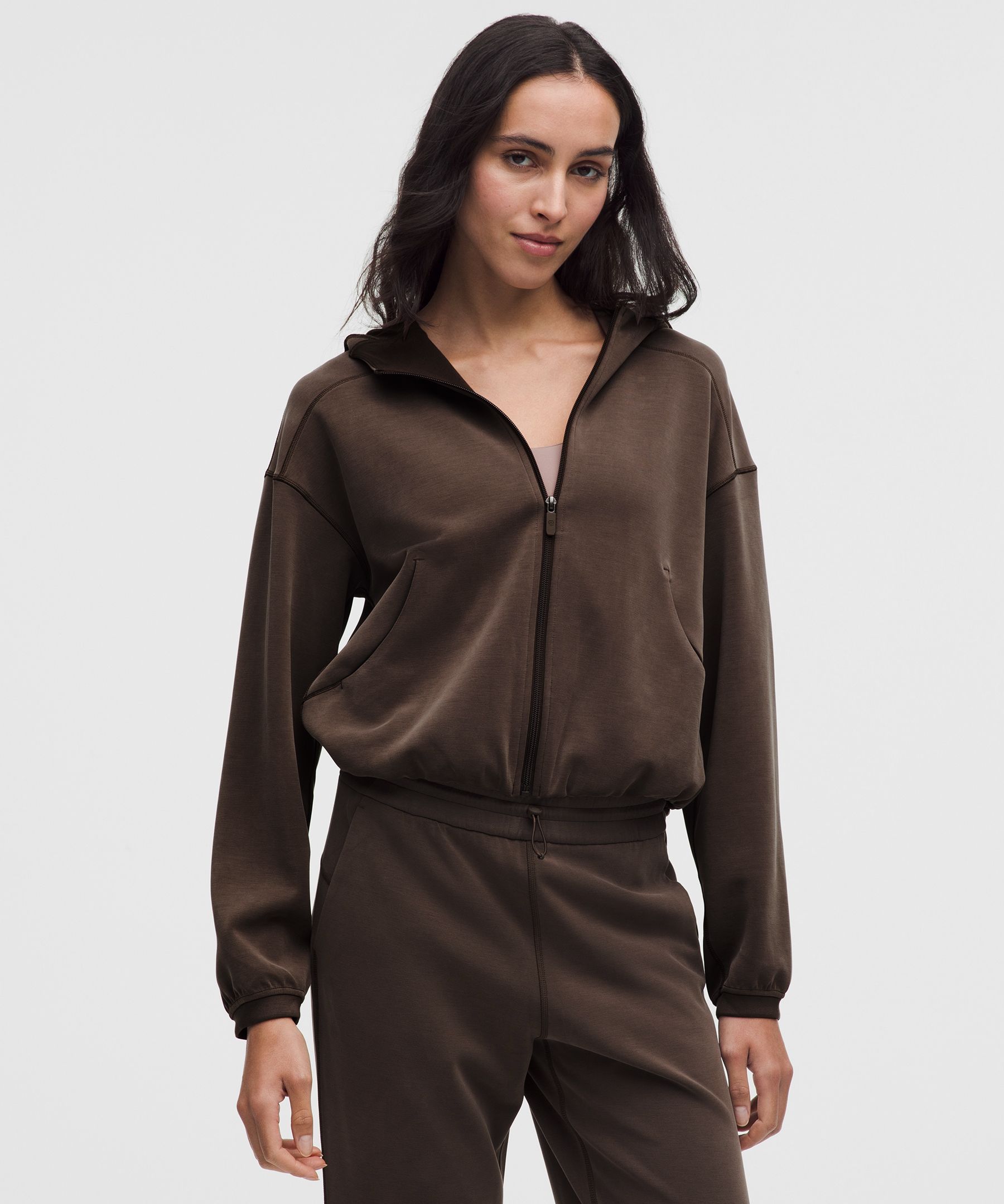 Designed for Casual. A loose fit with a little extra room. Not too short, not too long, just right around the waistband. Lend some luxe to your weekend look. Feel-it-to-believe it Softstreme fabric brings slinky softness to this hoodie while the gathered bubble hem adds a playful pop of volume. | lululemon – Women’s Softstreme Full-Zip Hoodie – Color Brown – Size 18