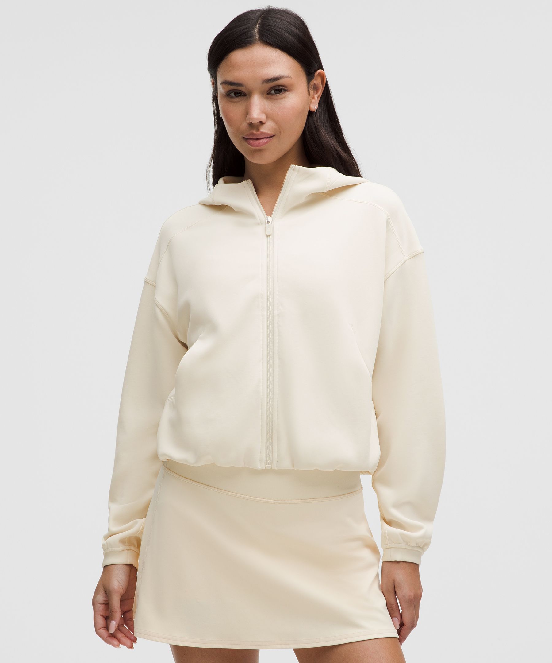 Designed for Casual. A loose fit with a little extra room. Not too short, not too long, just right around the waistband. Lend some luxe to your weekend look. Feel-it-to-believe it Softstreme fabric brings slinky softness to this hoodie while the gathered bubble hem adds a playful pop of volume. | lululemon – Women’s Softstreme Full-Zip Hoodie – Color White – Size 18