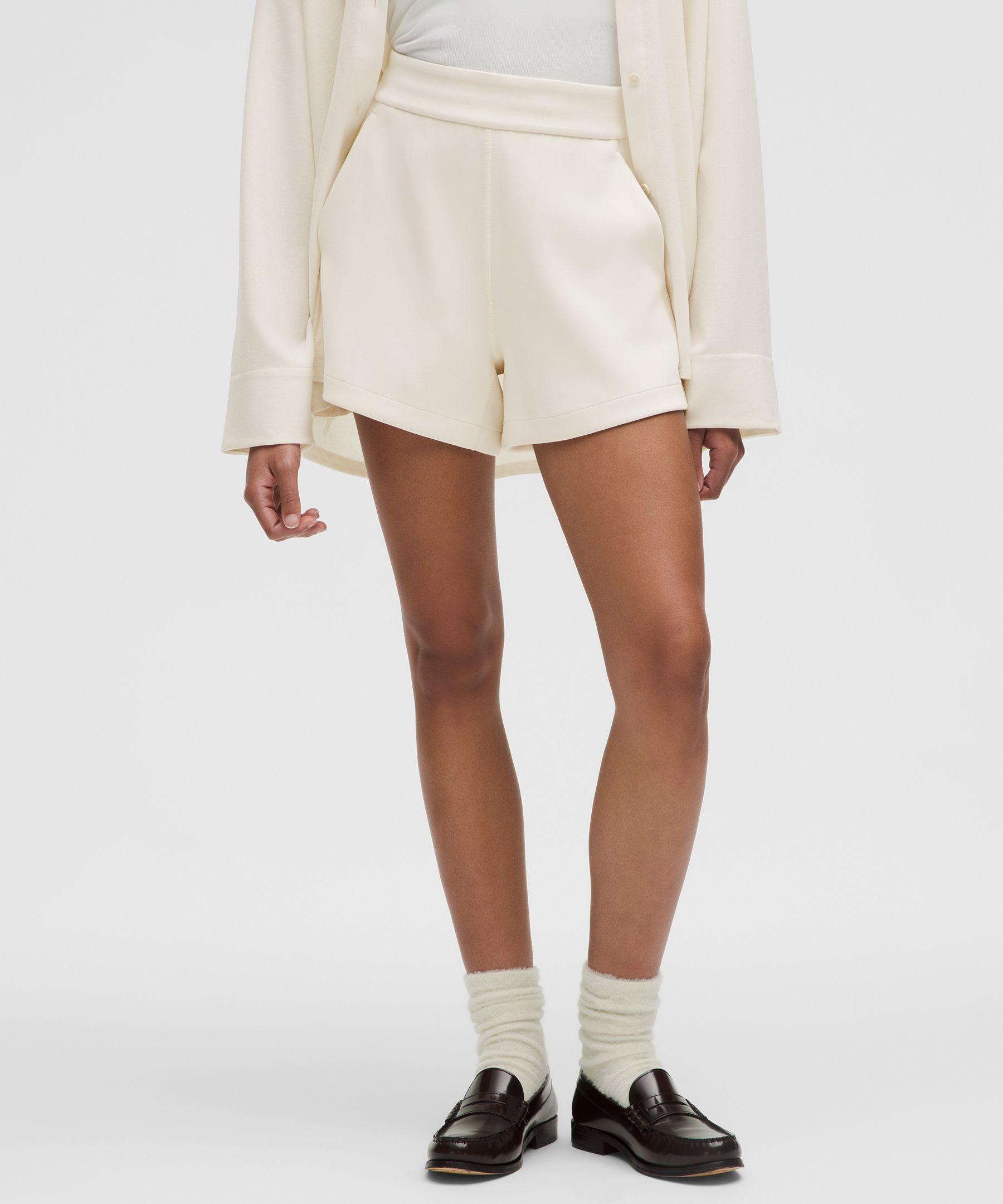 Pocketed, Drawstring. Designed for Casual. Feel it to believe it. These shorts have a peach-fuzz touch that’s impossible to resist. Dress them up or down and enjoy the softness all day. | lululemon – Women’s Softstreme High-Rise Shorts – 4″ – Color White – Size 6