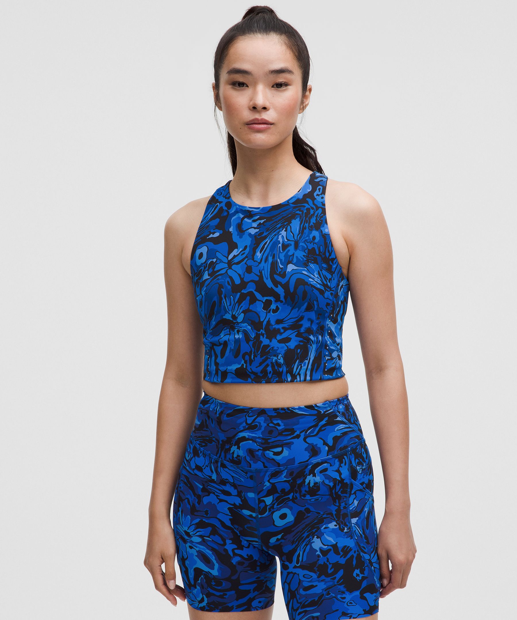 Shelf Bra. Designed for Running. Intended to provide medium support for a B/C cup. Tight fit contours your body. Cropped length is cut above the waist-perfect with high-rise pants. Intended for medium-impact activities. Got your back. A large zippered pocket on the back of this running tank keeps essentials close while you clock miles. | lululemon – Women’s Swift Speed Cropped Tank Top B/C Cup – Color Blue – Size 18