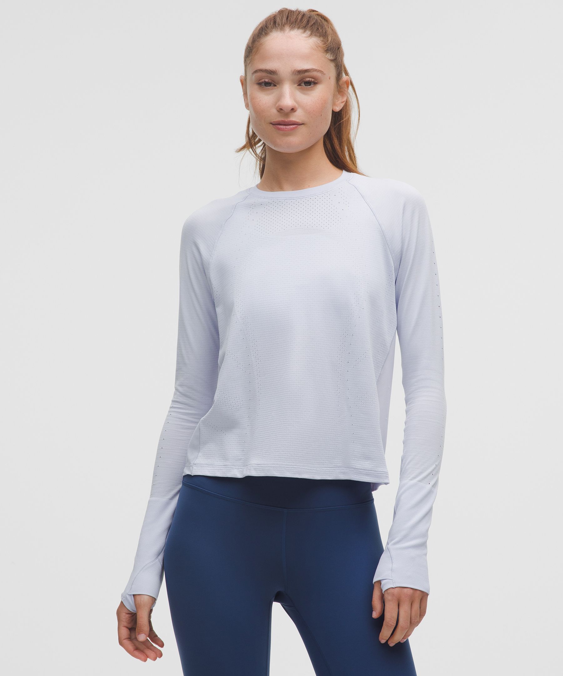 Thumbholes. Designed for Running and Training. An easy fit that floats away from your body. Not too short, not too long, just right around the waistband. Go ahead, get sweaty. This version of our Swiftly top has a mesh back to help keep air flowing when your workout heats up. | lululemon – Women’s Swiftly Mesh-Back Long-Sleeve Shirt – Color Blue/Purple – Size 16