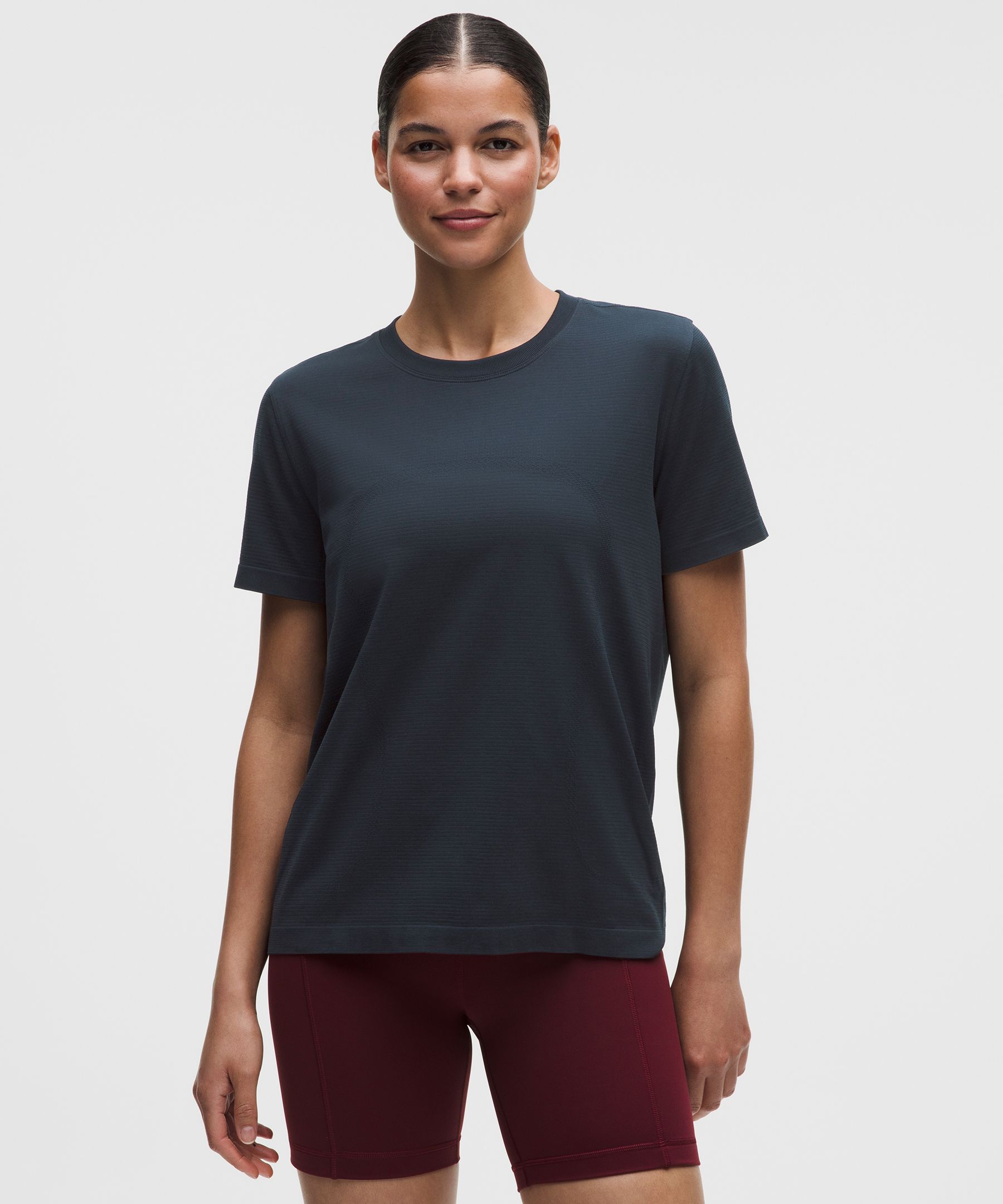Lightweight, Anti Stink. Designed for Running and Training. A loose fit with a little extra room. Sits below the waistband for moderate, everyday coverage. Go ahead, get sweaty. The Swiftly Relaxed collection is all about high-performing fabric that seamlessly adapts to you and your workout with a fit that gives you slightly more room to move. | lululemon – Women’s Swiftly Relaxed Short-Sleeve Shirt Hip Length Fit – Color Blue – Size 14