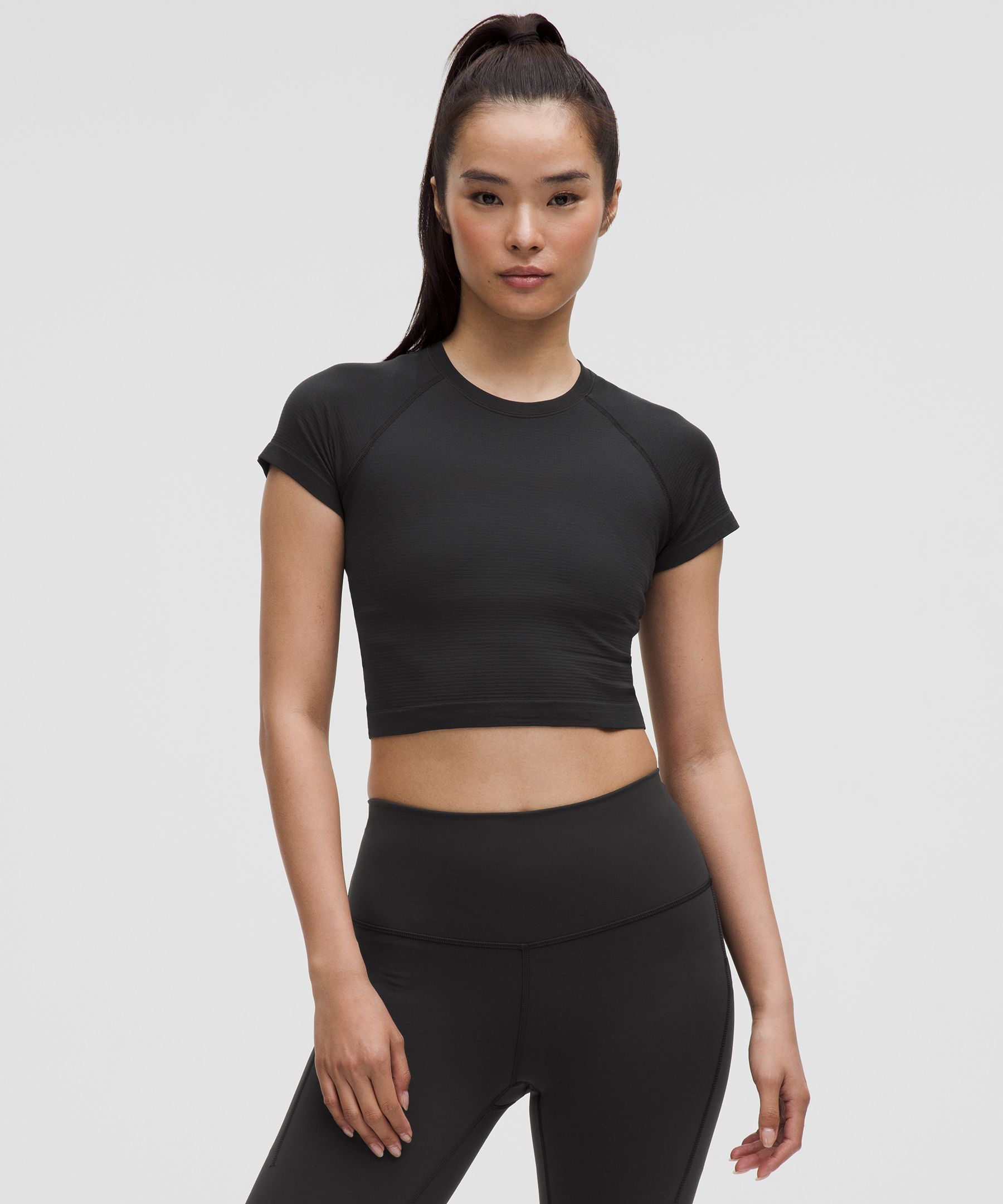 Anti Stink, Seamless. Designed for Running and Training. Skims your body. Cut above the waist-perfect with high-rise pants. Go ahead, get sweaty. The Swiftly collection is all about high-performing fabric that seamlessly adapts to you and your workout. | lululemon – Women’s Swiftly Tech Cropped Short-Sleeve Shirt 2.0 – Color Black – Size 16