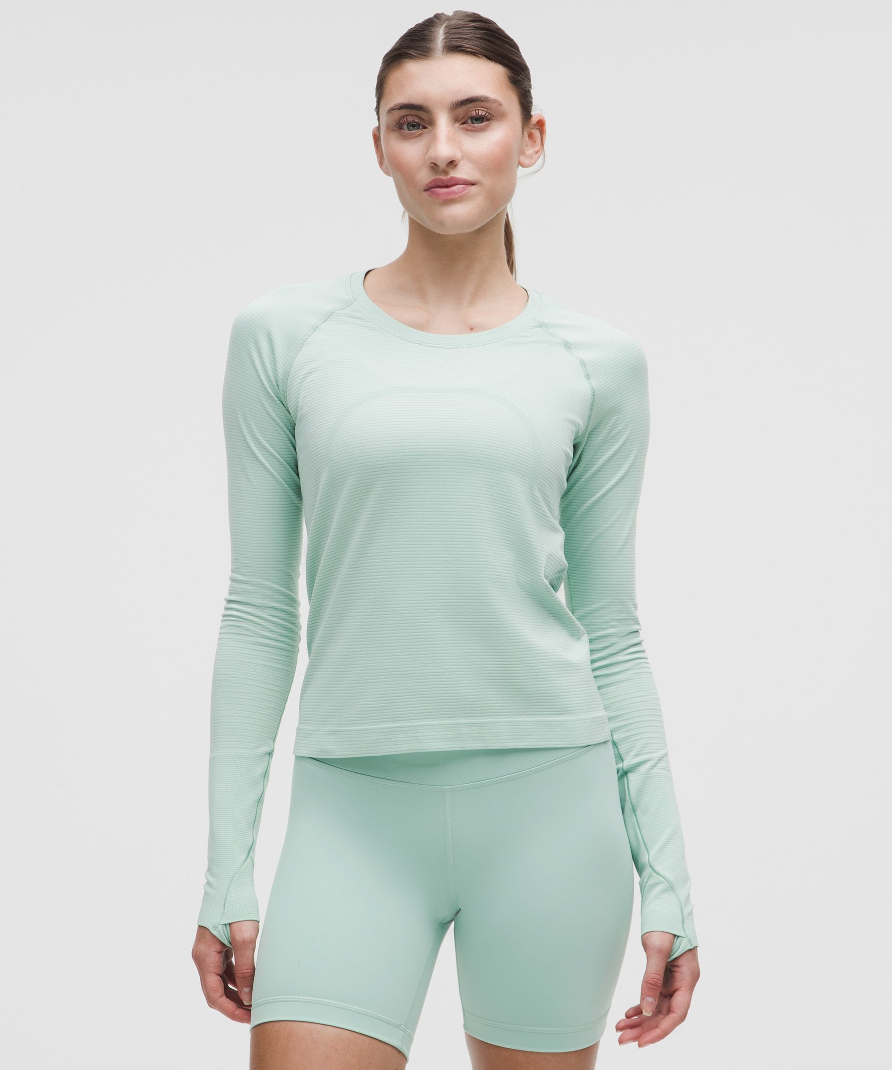 Anti Stink, Seamless, Thumbholes, Thermal. Designed for Running and Training. Skims your body. Shortened length won’t ride up on long runs or race day. Go ahead, get sweaty. The Swiftly collection is all about high-performing fabric that seamlessly adapts to you and your workout. | lululemon – Women’s Swiftly Tech Long-Sleeve Shirt 2.0 Waist Length – Color White/Green/Pastel – Size 10