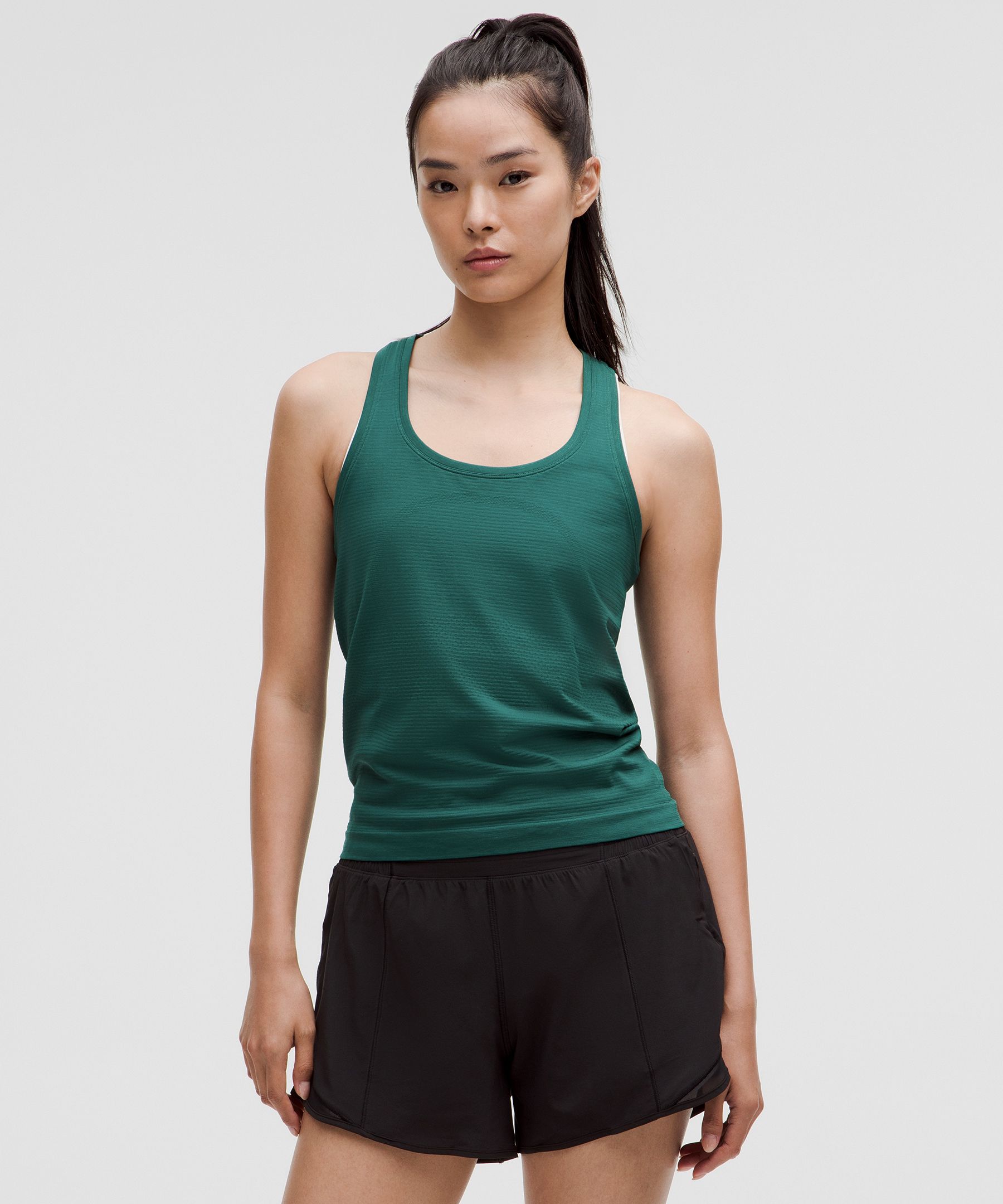 Anti Stink, Seamless. Designed for Running and Training. Skims your body. Shortened length won’t ride up on long runs or race day. Go ahead, get sweaty. The Swiftly collection is all about high-performing fabric that seamlessly adapts to you and your workout. | lululemon – Women’s Swiftly Tech Racerback Tank Top 2.0 Waist Length – Color Green – Size 16