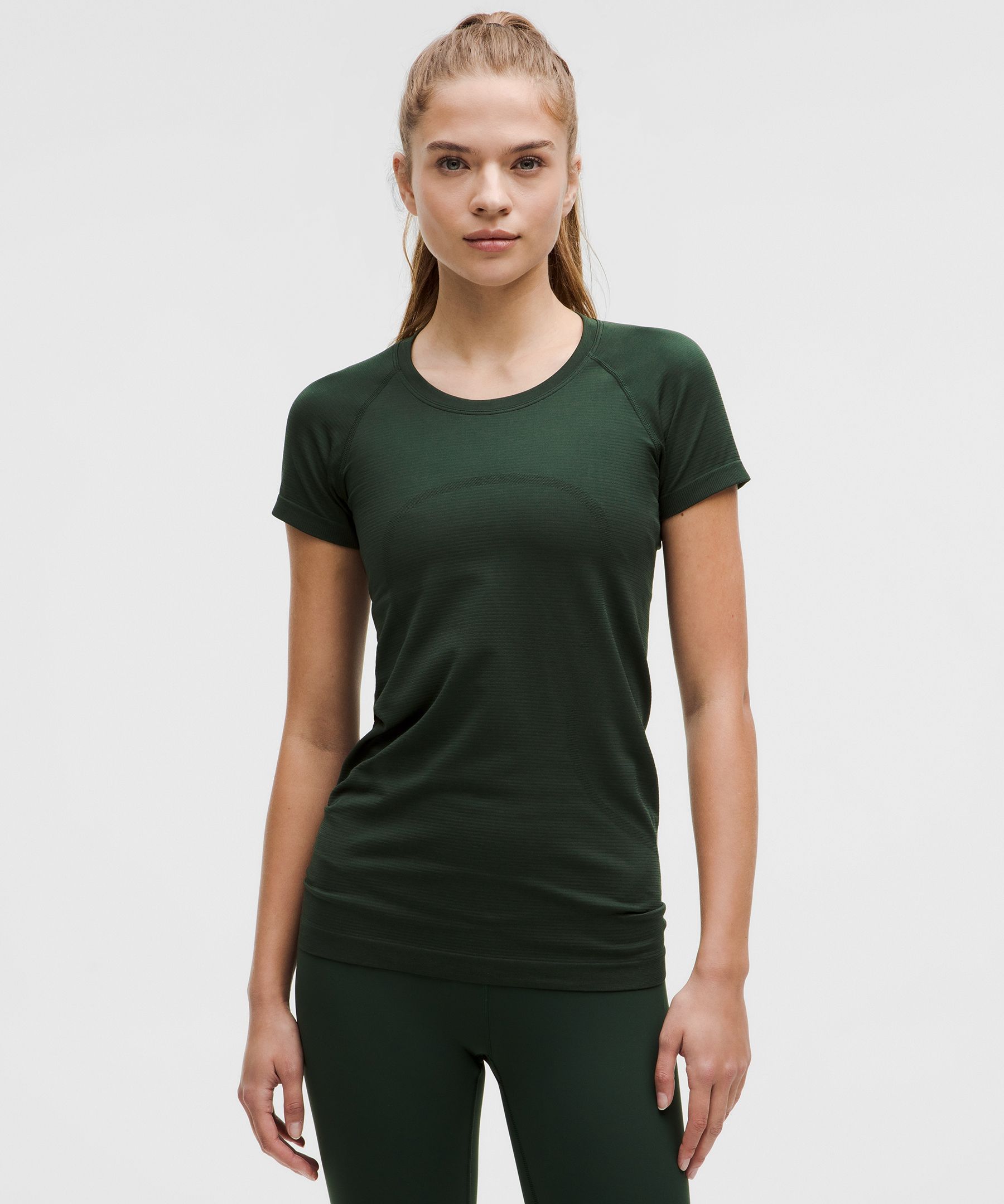 Anti Stink, Seamless. Designed for Running and Training. Skims your body. Sits below the waistband for moderate, everyday coverage. Go ahead, get sweaty. The Swiftly collection is all about high-performing fabric that seamlessly adapts to you and your workout. | lululemon – Women’s Swiftly Tech Short-Sleeve Shirt 2.4 Hip Length – Color Green – Size 4