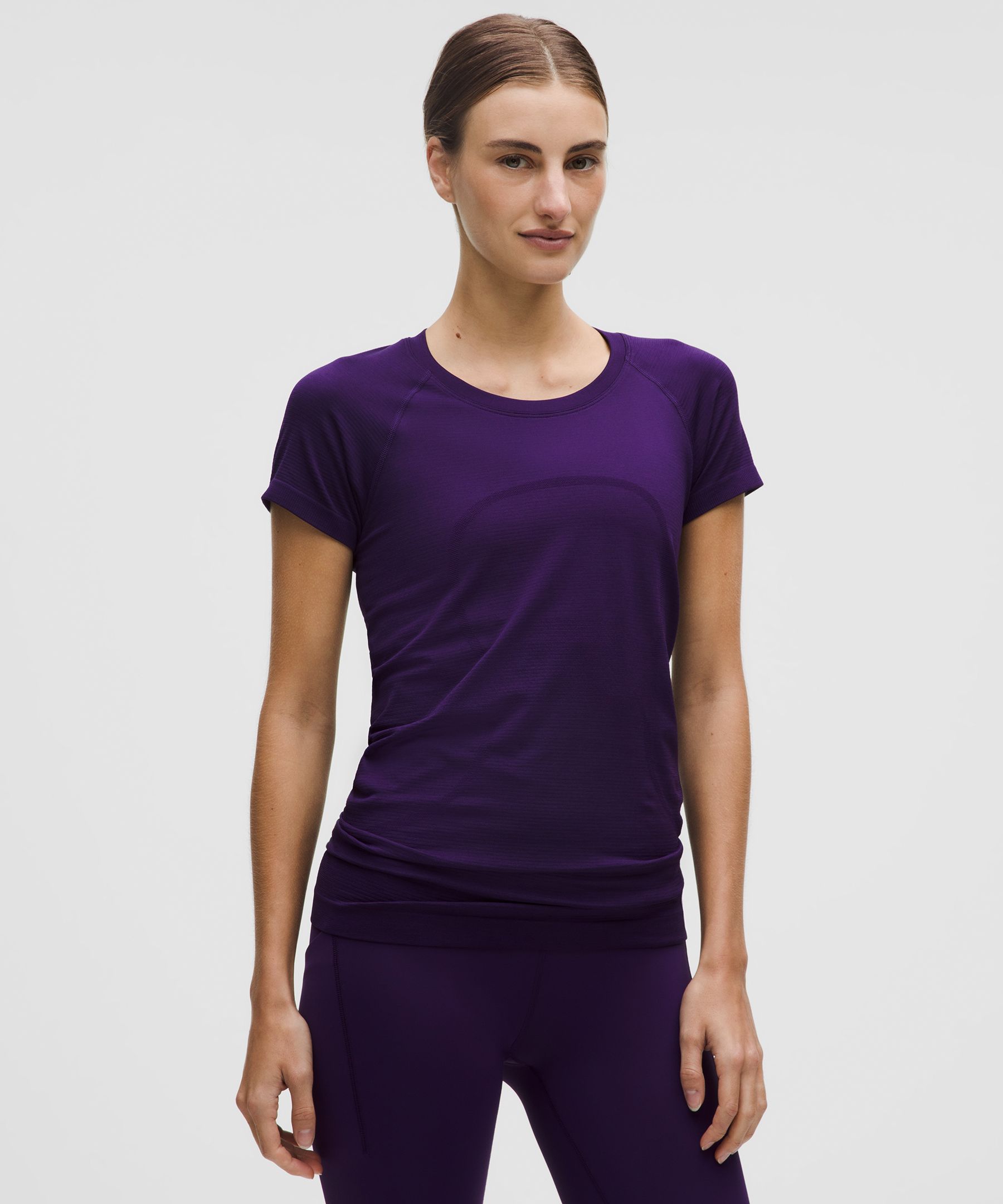Anti Stink, Seamless. Designed for Running and Training. Skims your body. Sits below the waistband for moderate, everyday coverage. Go ahead, get sweaty. The Swiftly collection is all about high-performing fabric that seamlessly adapts to you and your workout. | lululemon – Women’s Swiftly Tech Short-Sleeve Shirt 2.4 Hip Length – Color Purple – Size 4