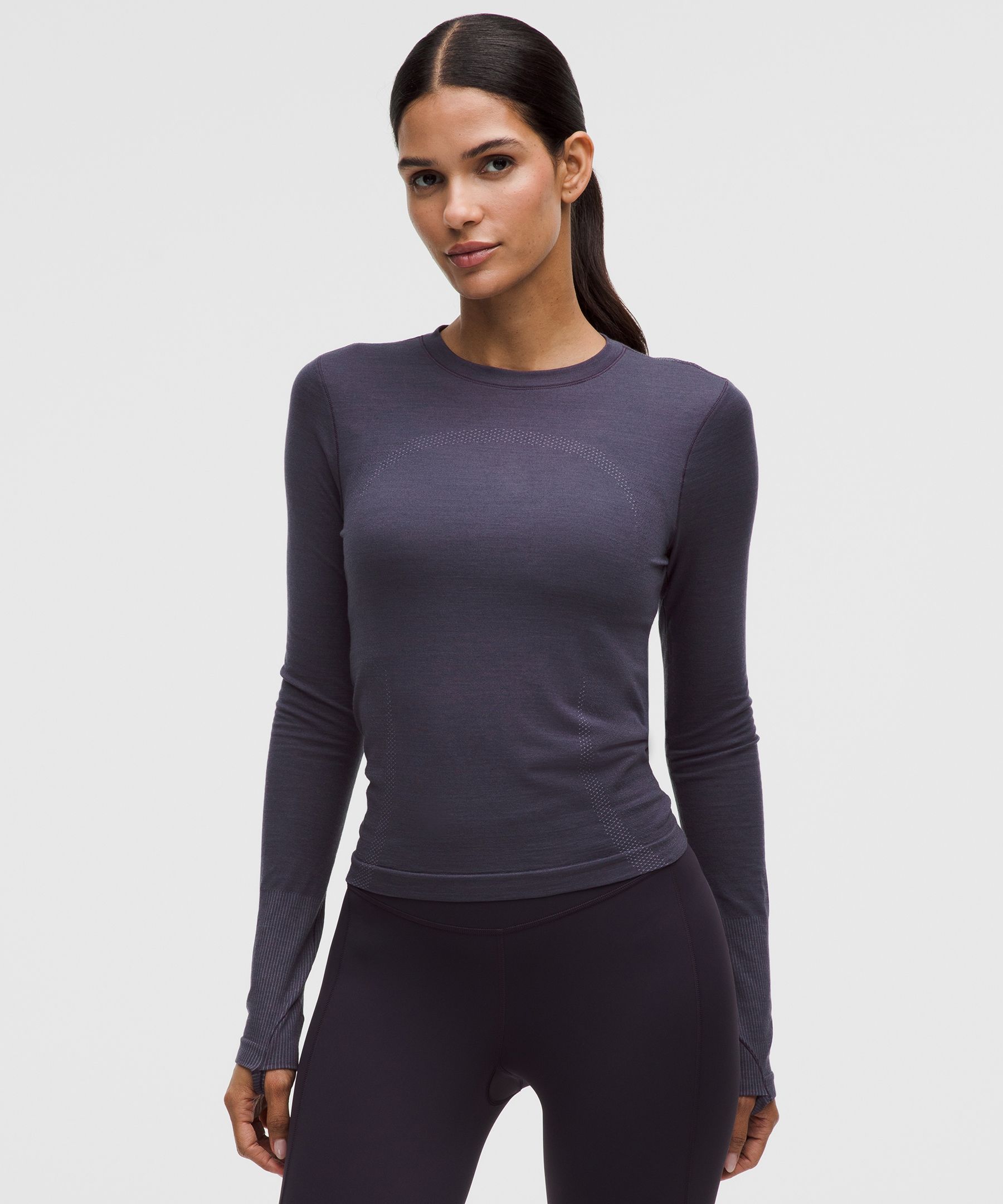 Designed for Running. Skims your body. Not too short, not too long, just right around the waistband. Just-right warmth. A touch of wool adds thermoregulation to this lightweight seamless layer, while open-knit construction keeps air flowing. | lululemon – Women’s Swiftly Wool Long-Sleeve Shirt – Color Purple – Size 10