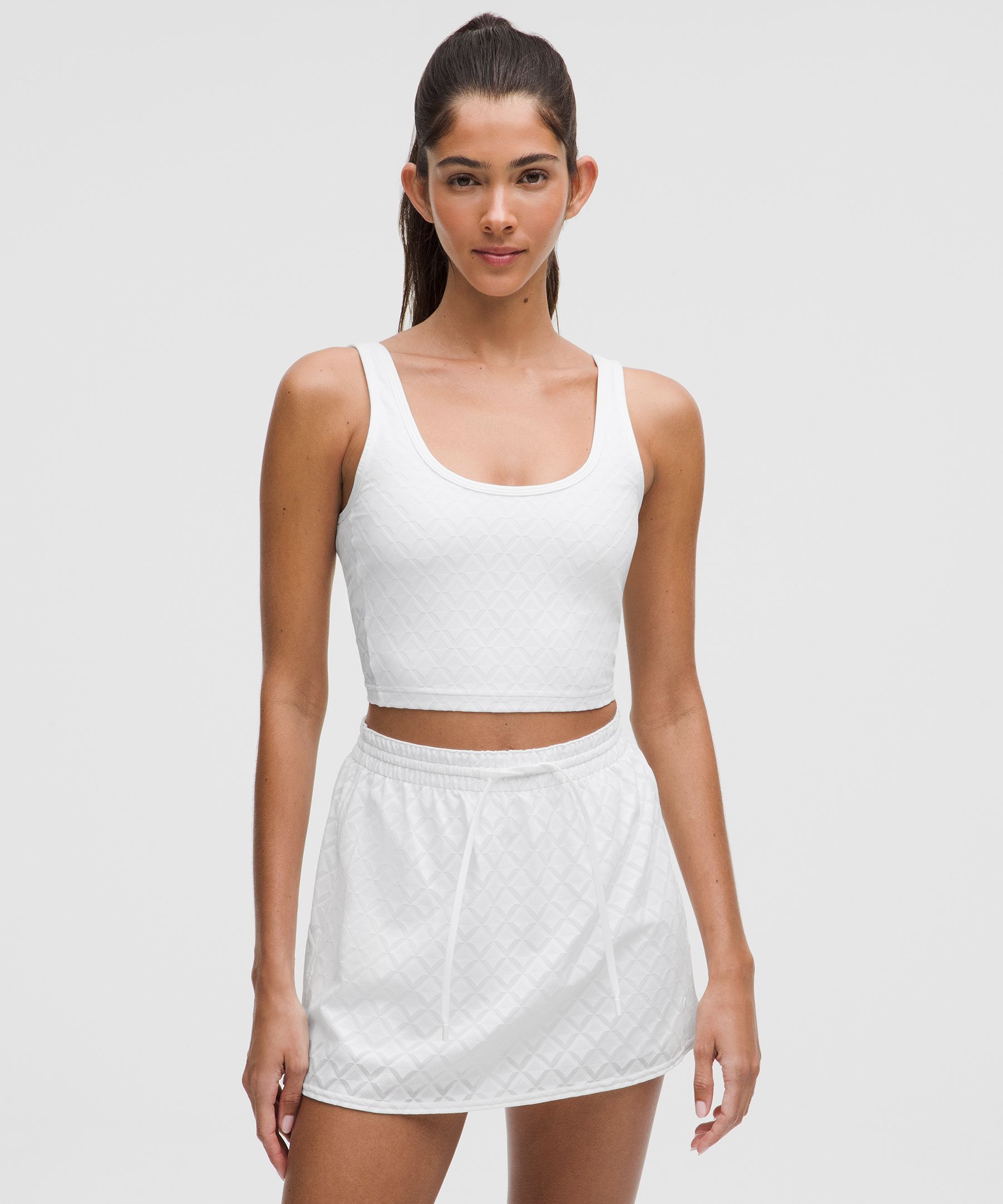 Shelf Bra. Designed for Tennis. Intended to provide support for B/C cups. Tight fit contours your body. Cropped length is cut above the waist-perfect with high-rise pants. Intended for medium-impact activities. Textural advantage. Cut from diamond-patterned mesh fabric, this supportive tennis tank scores points on and off the court. | lululemon – Women’s Textured Tennis Tank Top Medium Support, B/C Cup – Color White – Size Large