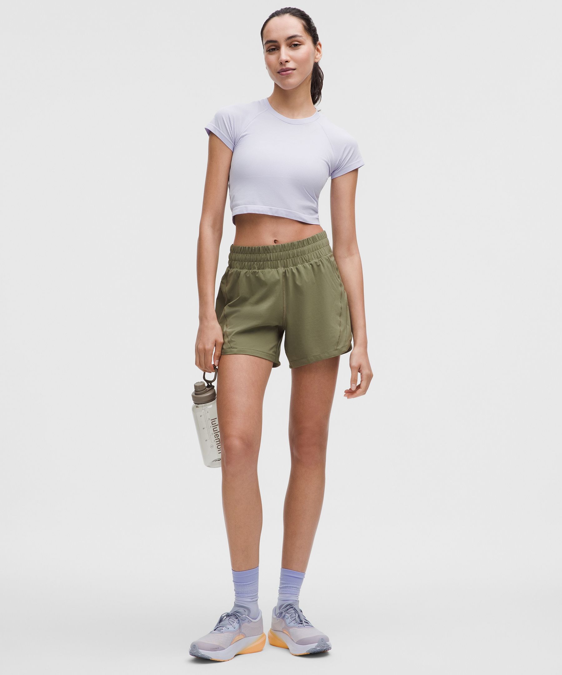 Drawstring, Pocketed. Designed for Running. Long strides welcome. We made these high-coverage run shorts with a little extra room in the leg opening. | lululemon – Women’s Track That High-Rise Lined Shorts – 5″ – Color Green – Size 18