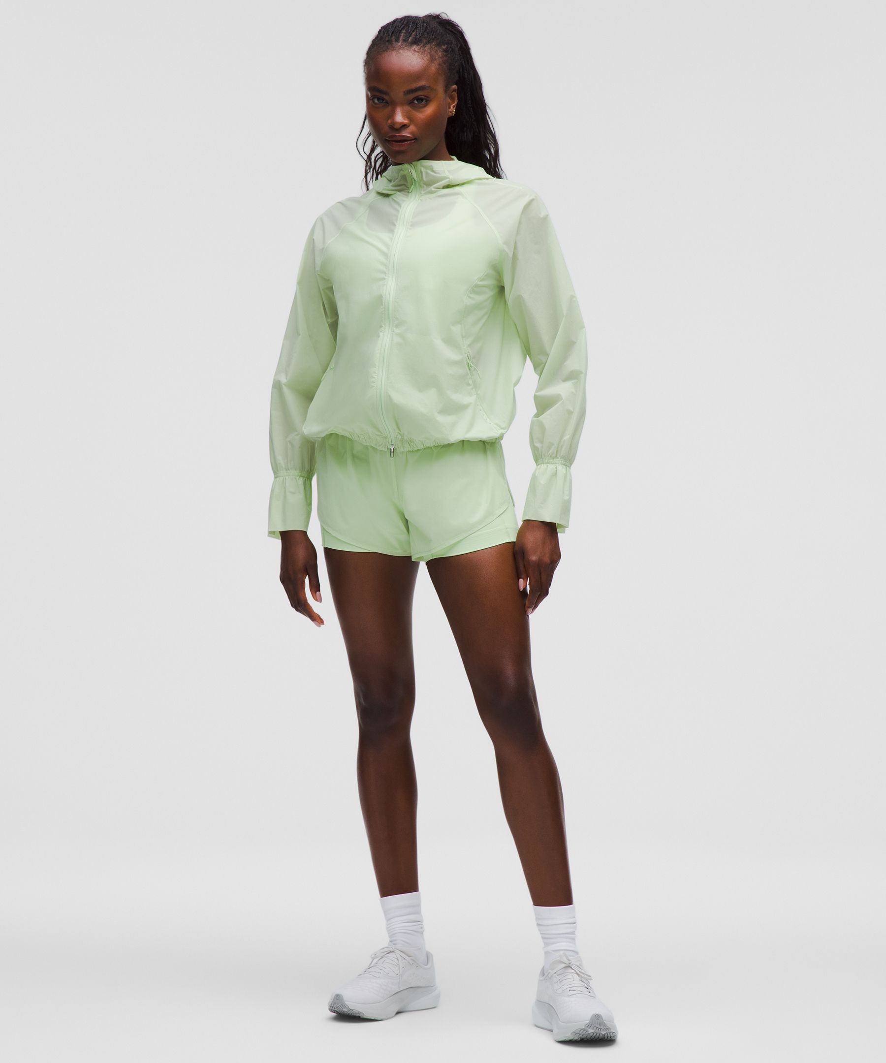 Lightweight, Drawstring, Reflective. Designed for Running. Sheer potential. These two-in-one run shorts combine the weightless coverage of a half tight with a tough-but-translucent outer shell. | lululemon – Women’s Translucent 2-in-1 High-Rise Shorts – 4″ – Color Green – Size Large
