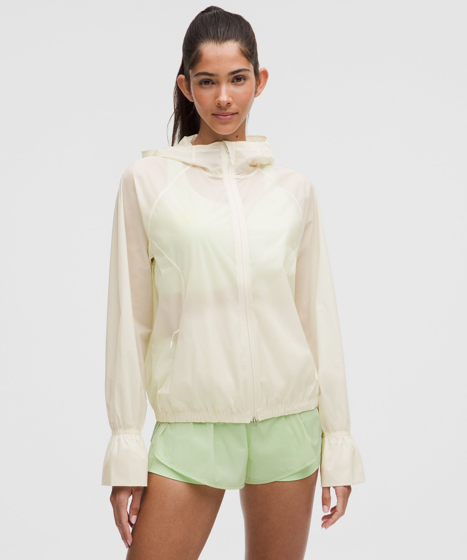 Lightweight, Pocketed, Reflective. Designed for Running. A loose fit with a little extra room. Sits below the waistband for moderate, everyday coverage. Sheer potential. This hooded run jacket is made from translucent fabric for endless ways to layer | lululemon – Women’s Translucent Hooded Jacket – Color White – Size Large
