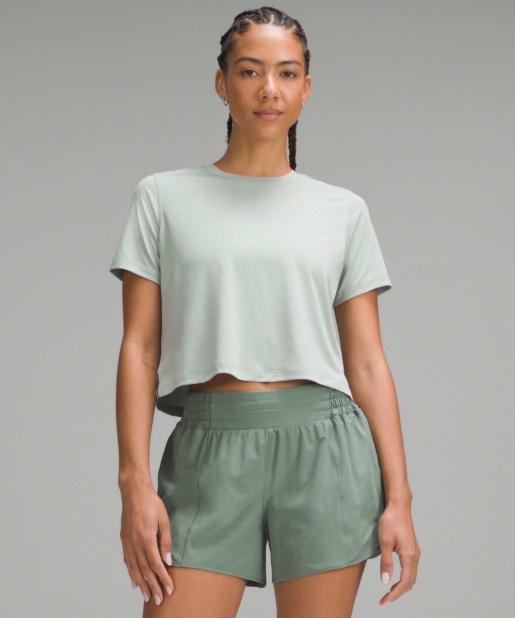 Anti Stink. Designed for Running and Training. An easy fit that floats away from your body. Not too short, not too long, just right around the waistband. Is this thing on? From burpees to sprints to jumping jacks, this ultra-lightweight top feels so barely-there, you might forget you’re wearing it. | lululemon – Women’s Ultralight Waist-Length T-Shirt – Color Grey/Green/Pastel – Size 6