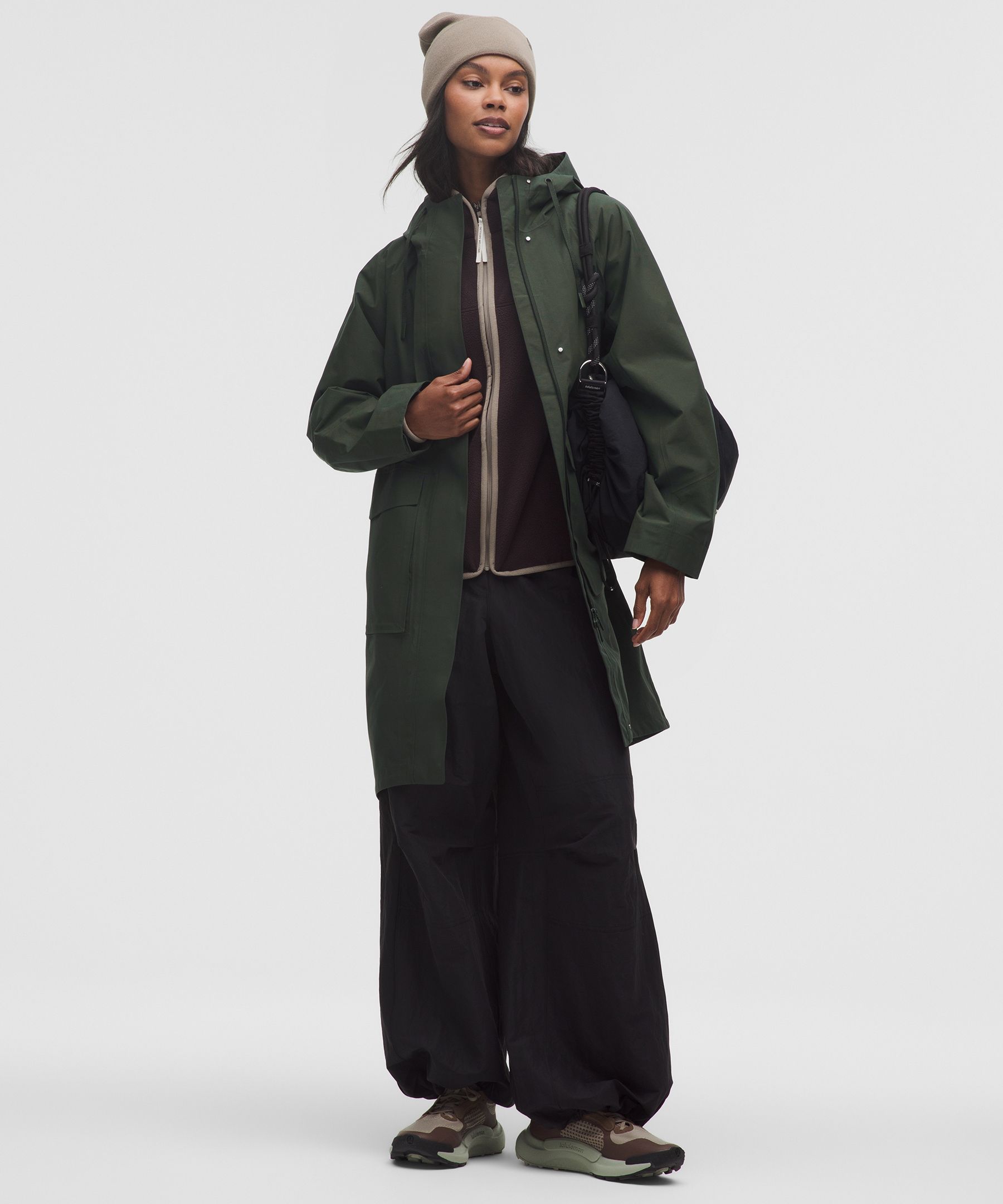 Pocketed, Waterproof, Windproof. Designed for Casual. Relaxed fit feels roomy and can be worn over larger layers. Size down if you prefer a slimmer fit. If you like afternoon walks and getting caught in the rain, this jacket is for you. It’s seam-sealed for full waterproof protection so you can step confidently into the weather. | lululemon – Women’s Waterproof Fishtail Rain Coat – Color Green – Size Small