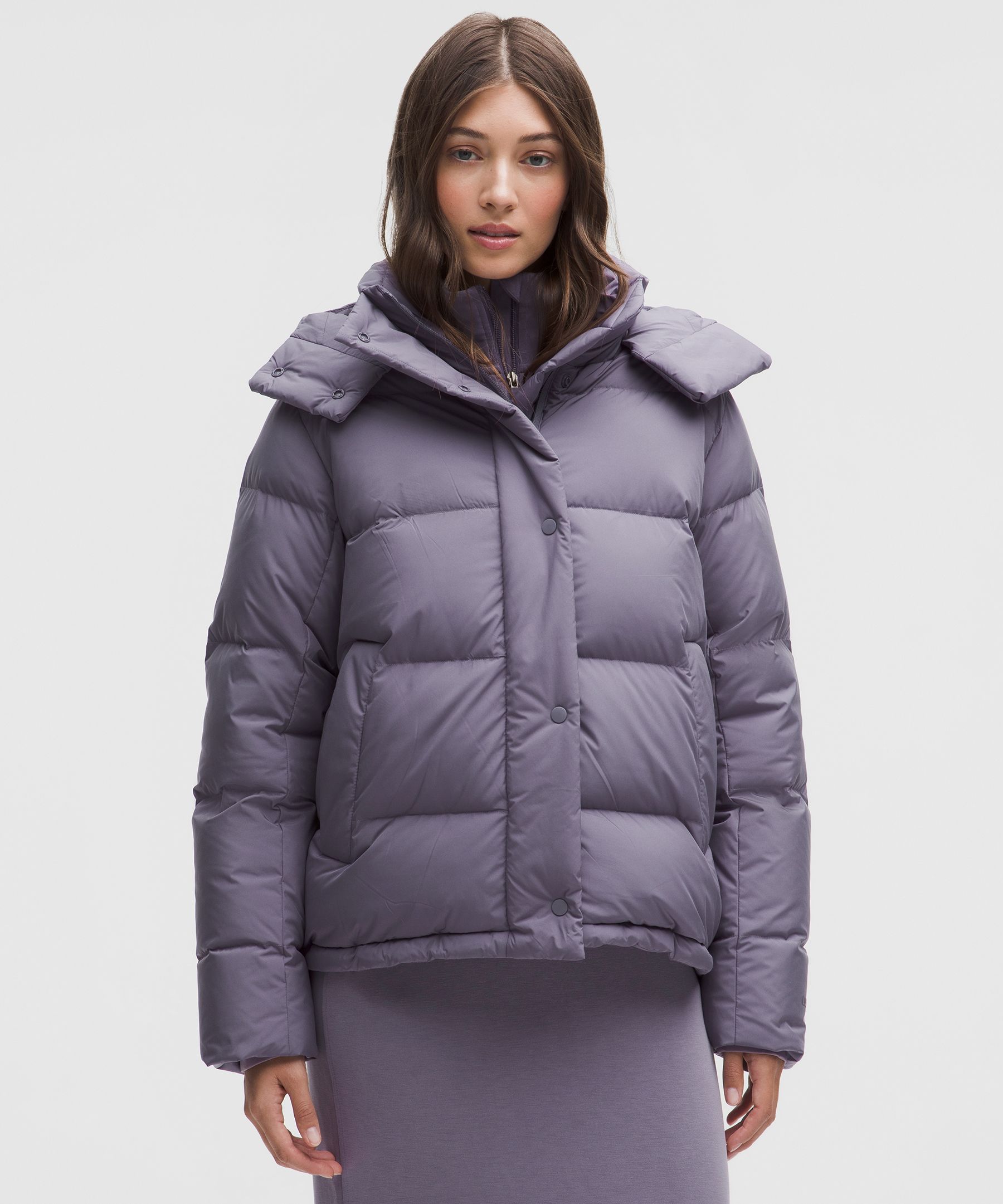 Down, Insulated, Pocketed, Drawstring. Designed for Casual. Relaxed fit feels roomy and can be worn over larger layers. Size down if you prefer a slimmer fit. This wonderfully warm down puffer has a cinchable waist and hem that lets you customize the shape and keep out cold drafts. | lululemon – Women’s Wunder Puff 1000-Down-Fill Jacket – Color Purple – Size 10