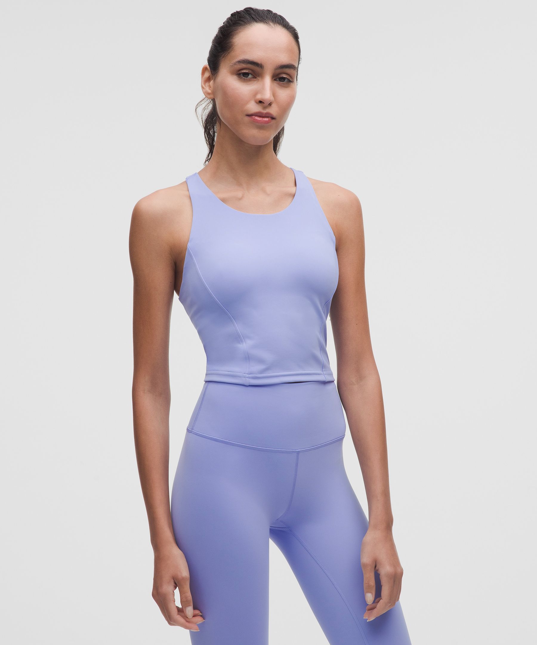 Shelf Bra. Designed for Training. Intended to provide medium support for B/C cups. Tight fit contours your body. Cropped length is cut above the waist-perfect with high-rise pants. Intended for medium-impact activities. Cut from highly breathable Everlux fabric, this tank features a narrow racerback for freedom of movement and sleek coverage across the chest, neckline, and front armholes. | lululemon – Women’s Wunder Train Racerback Tank Top Medium Support, B/C Cup – Color Purple/Pastel – Size 16