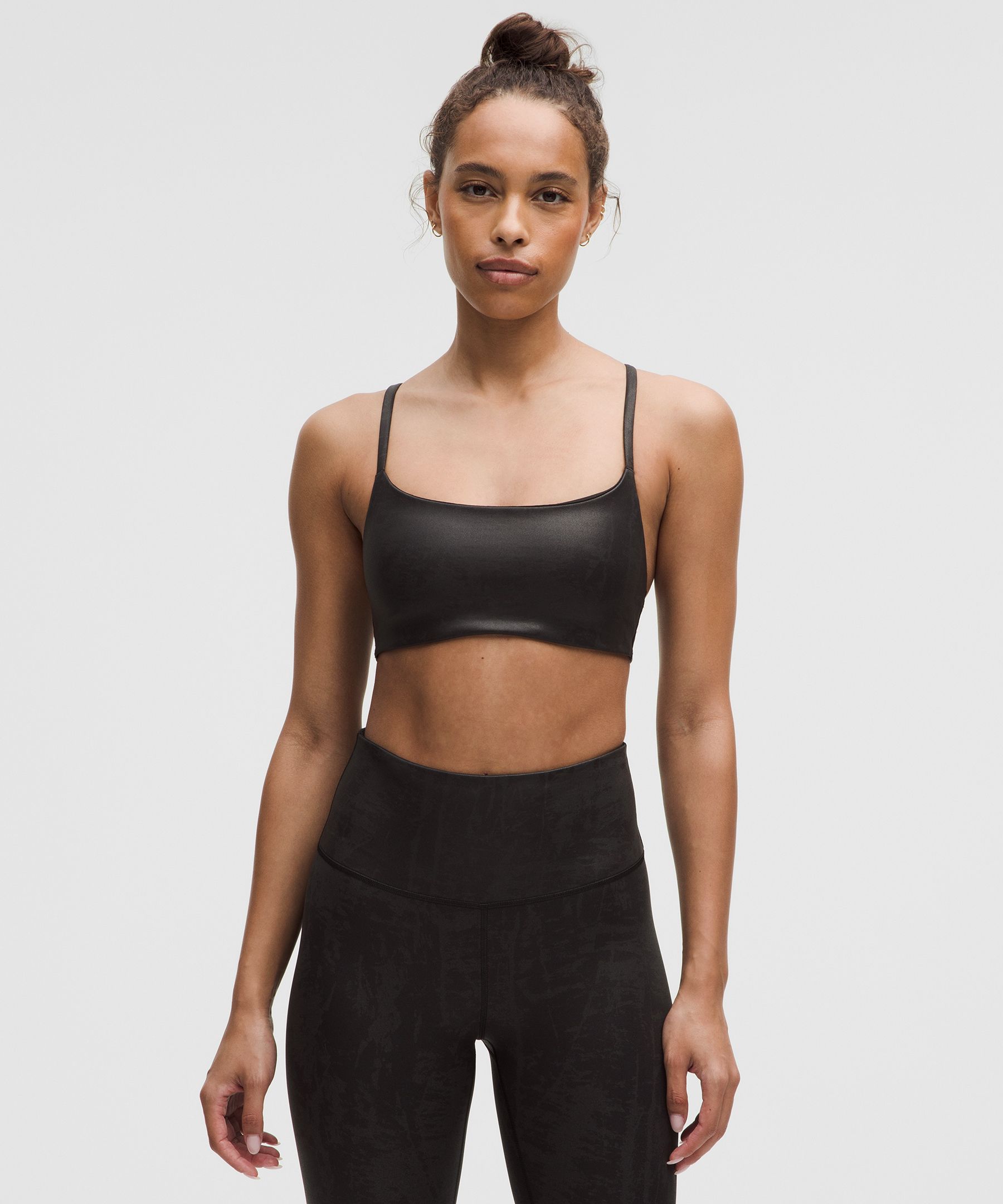 Designed for Training and Pilates. Intended for low-impact activities. Focus on every push, press, and hold. This narrow-strap bra is intentionally designed with a light feel that lets you stay hyper-mindful. | lululemon – Women’s Wunder Train Strappy Racer Sports Bra Light Support, A/B Cup Foil – Color Black – Size 16
