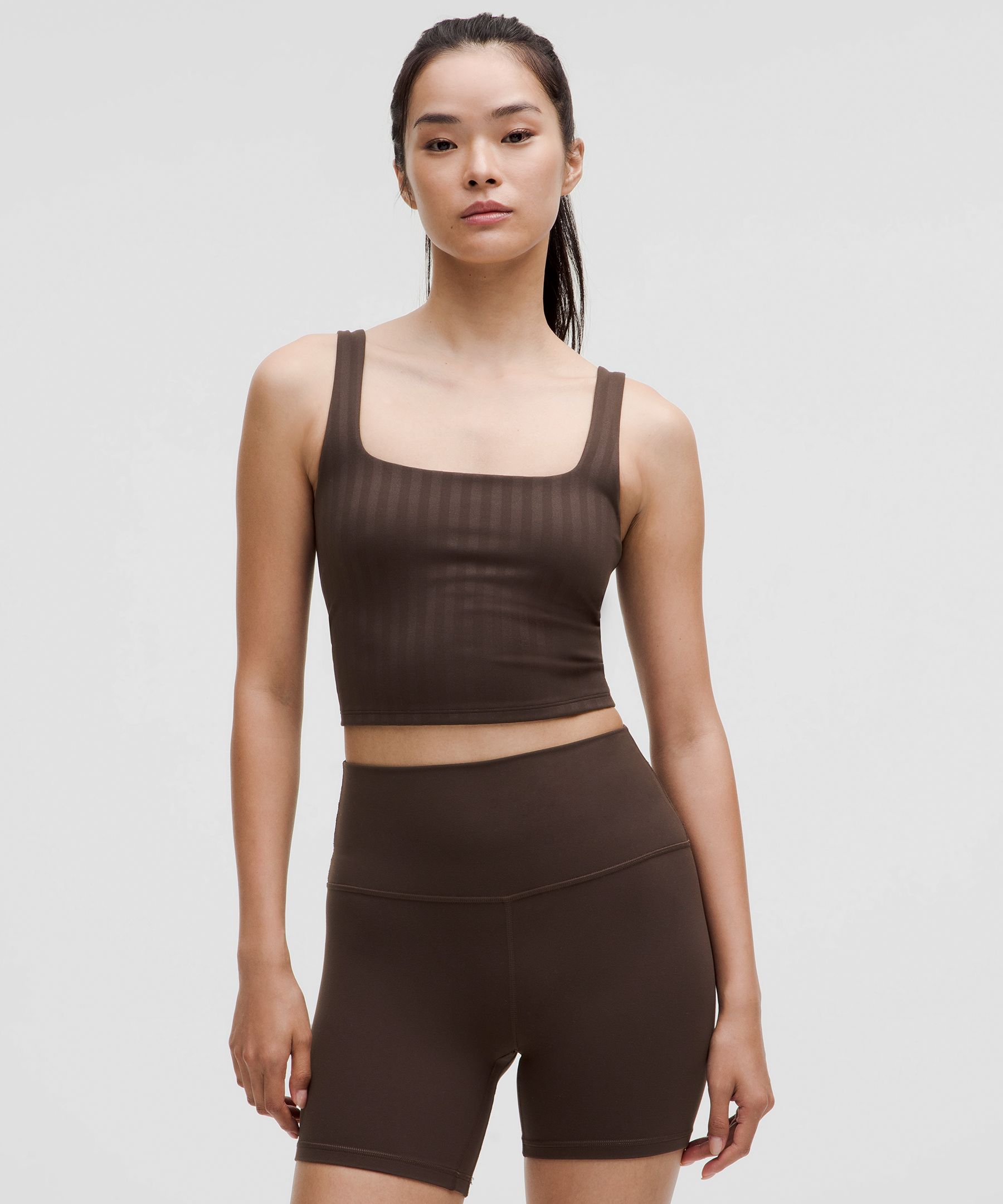 Shelf Bra. Designed for Yoga and Training. Intended to provide light support for A/B cups. Tight fit contours your body. Cropped length is cut above the waist-perfect with high-rise pants. Intended for low-impact activities. Flow, train, or restore in our versatile Wunder Under collection. This square-neck tank has a built-in shelf bra to give you light support. | lululemon – Women’s Wunder Under Cropped Tank Top Light Support, A/B Cup Tonal Stripe – Color Brown – Size 18