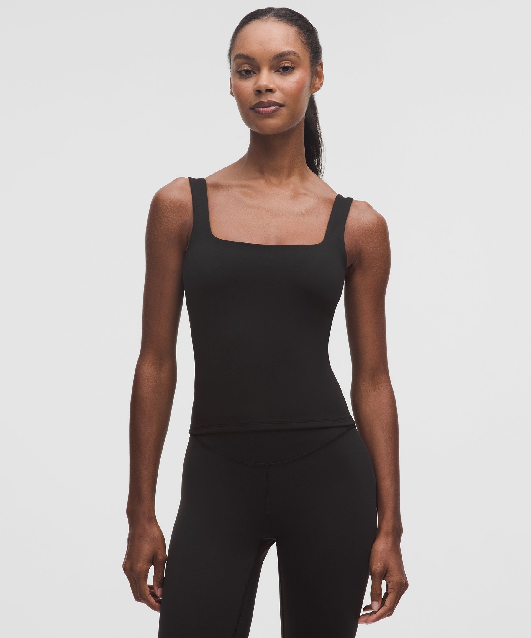Shelf Bra. Designed for Yoga and Training. Intended to provide light support for A/B cups. Tight fit contours your body. Waist length is not too short, not too long, just right around the waistband. Intended for low-impact activities. Train, flow, or restore in the versatile Wunder Under collection. This square-neck tank has a built-in shelf bra to give you light support for all the ways you love to move. | lululemon – Women’s Wunder Under SmoothCover Tank Top Light Support, A/B Cup – Color Black – Size 18