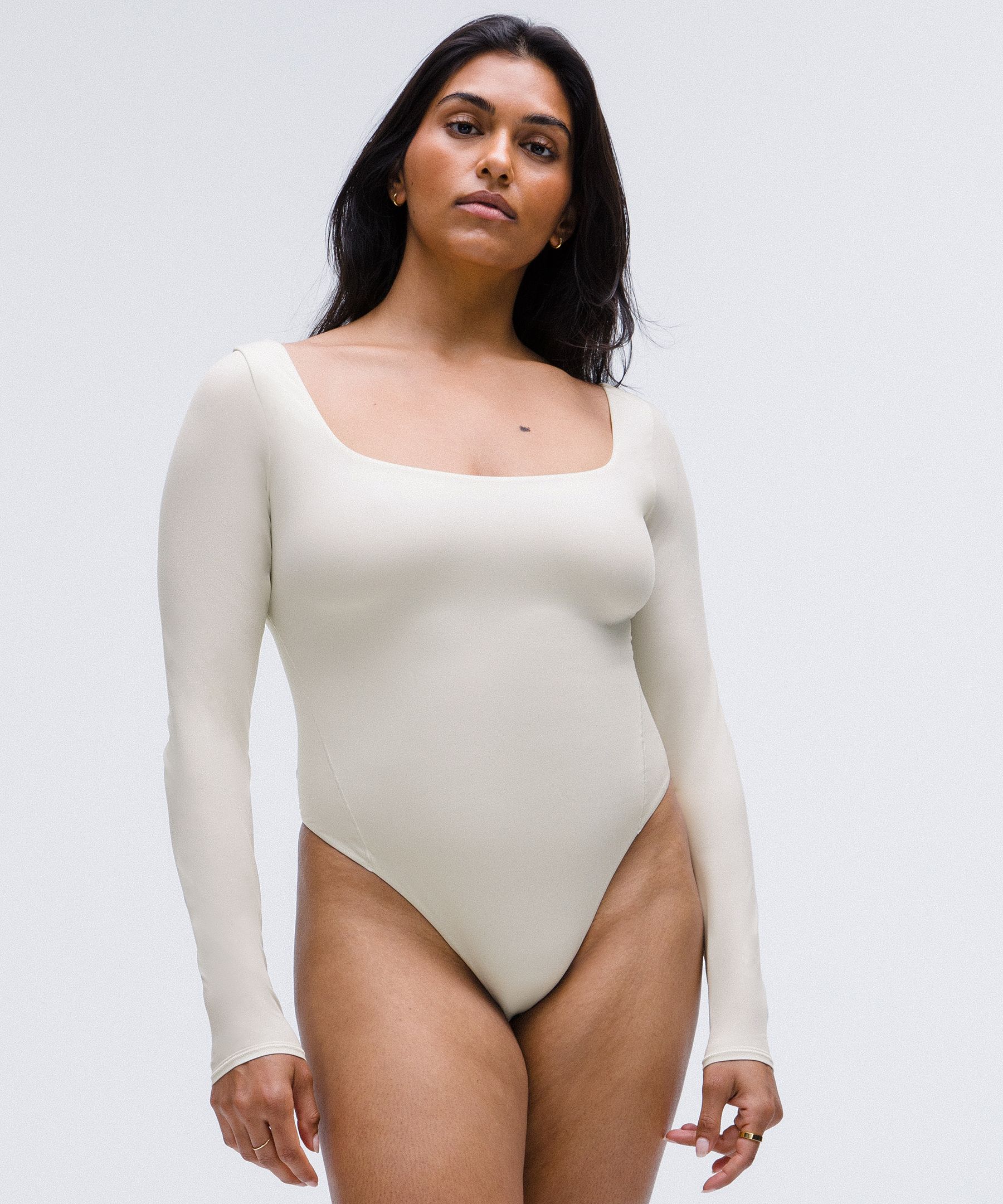 Designed for Casual. Fabric is double layered for coverage, support, and a seriously soft feel on both sides. The sleeves have a single layer of fabric for a lighter feel. Contours your body with a fit that feels snug. For a more gentle feel, opt for a size up. Right in the feels. This long-sleeve bodysuit is made from a peach-fuzz soft version of our Nulu fabric to give a soft embrace and an elevated look to your daily routine. | lululemon – Women’s Wundermost Ultra-Soft Nulu Square-Neck Long-Sleeve Bodysuit – Color White – Size Medium